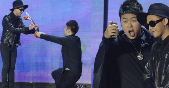 他先是拿出手机和对方自拍,接着更是直接向对方单膝下跪,表达自己对权志龙的喜爱和崇敬之情。