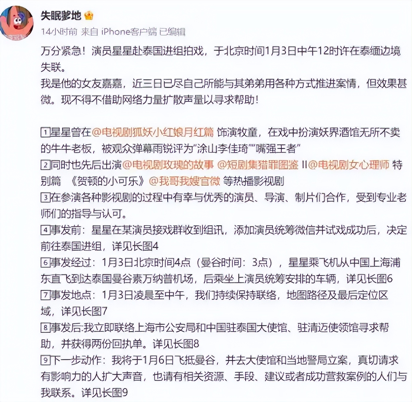 文中表示,一个名叫王星的演员,在赴泰拍戏时,意外失联。