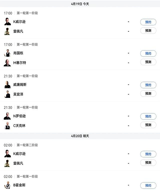 这三位选手,雷佩凡对阵凯伦·威尔逊,下午五点和明天凌晨两点开打;肖国栋对阵马丁·塞尔特,也是下午五点;吴宜泽对阵马克·威廉姆斯,晚上九点半。