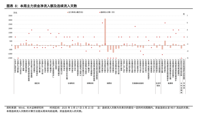 本周主力净流入总额为660万元,市场交投热情较上周有所回落。主力资金净流入层面,从不同底层资产REITs来看,周内主力净流入额前三的底层资产类型是保障性租赁住房类/仓储物流类/消费基础设施类,净流入额分别为673/585/281万元;从单只REIT来看,周内主力净流入额前三的REITs是华夏华润商业REIT/中航京能光伏REIT/红土创新盐田港REIT,净流入额分别为3150/541/362万元,连续流入天数分别为-1/5/-2天。(注:连续流入天数为负表示的是在一定的时间周期内,资金连续从该REIT流出的天数;本周连续流入天数的计算方法是从周末向前追溯,资金连续流入的天数。)