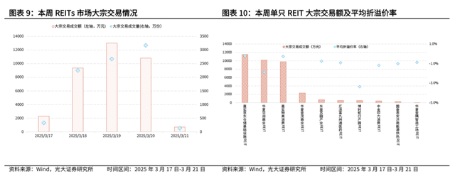 大宗交易:本周大宗交易总额环比上周有所回落。本周周内有5个大宗交易日,大宗交易总成交额为36208万元,星期三(2025年3月19日)大宗交易成交额是周内单日最高,为13028万元;单只REIT来看,周内大宗交易成交额前三的是嘉实京东仓储基础设施REIT/华夏华润商业REIT/嘉实物美消费REIT。