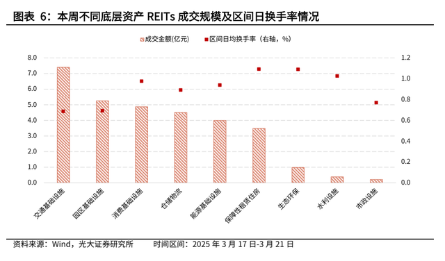 本周公募REITs成交规模保持稳定,保障性租赁住房类REITs区间日均换手率领先其他。截至本周,已上市的63只REITs周内总成交额为31.1亿元,周内区间日均换手率均值为0.91%,成交规模较上周保持稳定。成交额方面,周内成交额前三的REITs资产类型是交通基础设施类/园区基础设施类/消费基础设施类,成交额分别为7.3/5.3/4.9亿元;换手率方面,周内区间日均换手率前三的REITs资产类型是保障性租赁住房类/生态环保类/水利设施类,分别为1.09%/1.09%/1.03%。