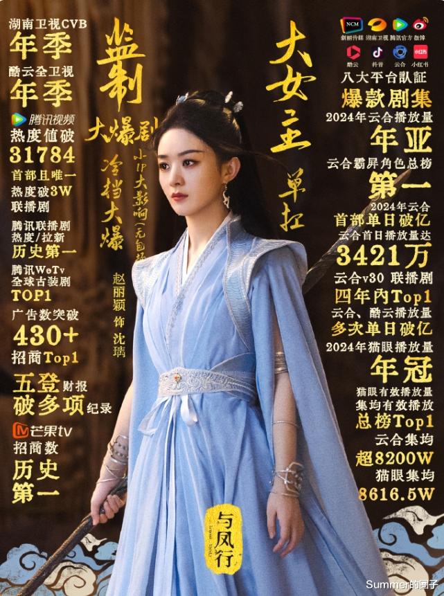 赵丽颖最后一部古偶是《与凤行》,腾讯和芒果双平台网播,湖南卫视上星播出,这部剧开局企鹅8个广告,芒果7个广告,首日云合播放量3421万,历史排名第二,仅次于《庆余年2》,开播25小时热度破30000万,最终热播期云合集均6855万,年度排名第二,CVB收视率0.5%,湖南卫视年季。
