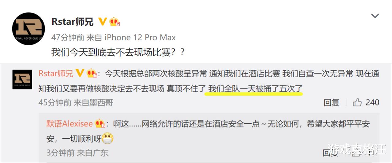 不过LPL观众最关心的还是自家战队,RNG运营负责人表示,队伍可能去不了现场比赛,两次核酸呈现异常,拳头通知他们在酒店进行比赛。但是RNG自查一次并没有问题,还要再做核酸再决定去不去现场,R师兄表示一天进行了5次核酸!我觉得在哪里打比赛都行,选手身体健康才是第一位,前几场比赛看下来,入围赛的强度不高,相信RNG能够晋级小组赛。