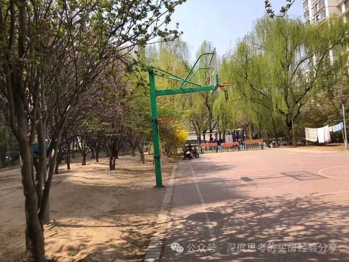 小区绿化好,中间有个广场,周围绿树环绕,有健身设施,有篮球架;