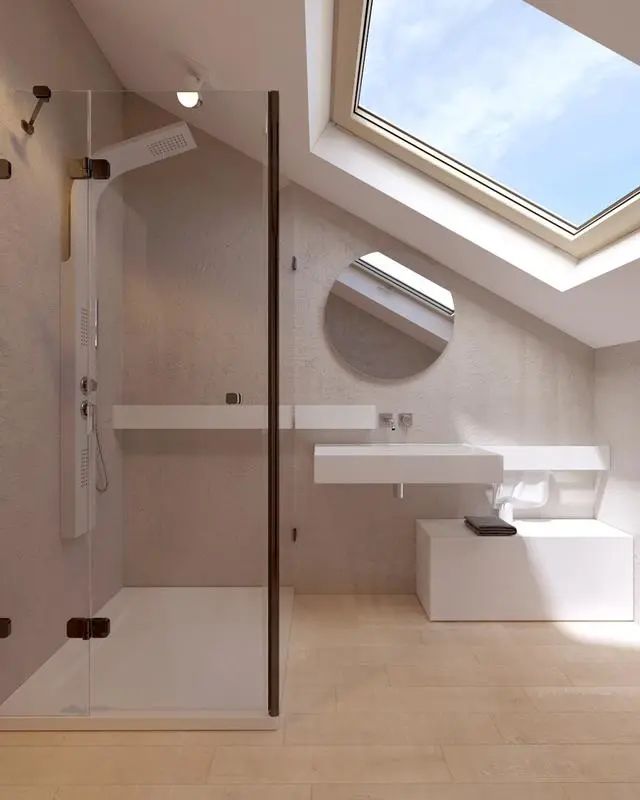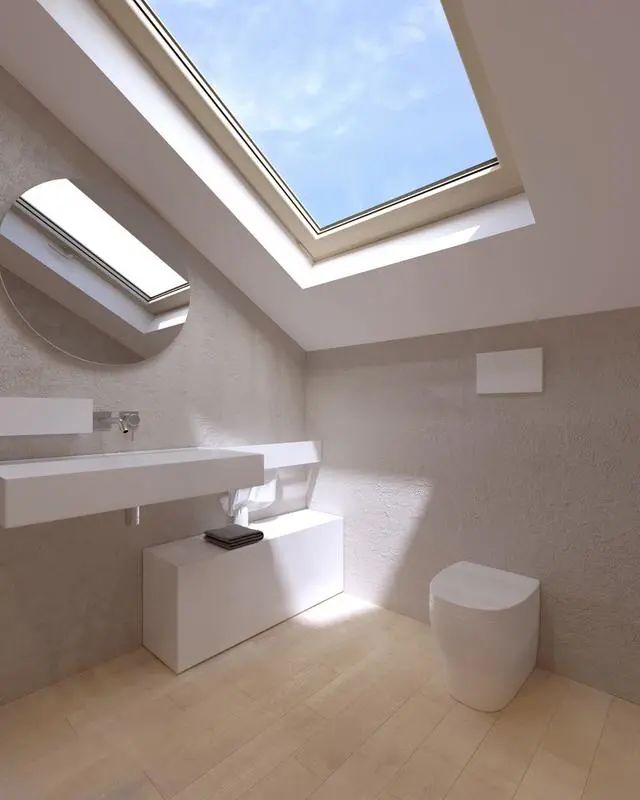 卫生间居然也有一个巨大的斜顶天窗,虽然没有人会在屋顶偷看,还是有点担心隐私啊。透明玻璃隔开了淋浴区,不用担心水花浸湿地板。