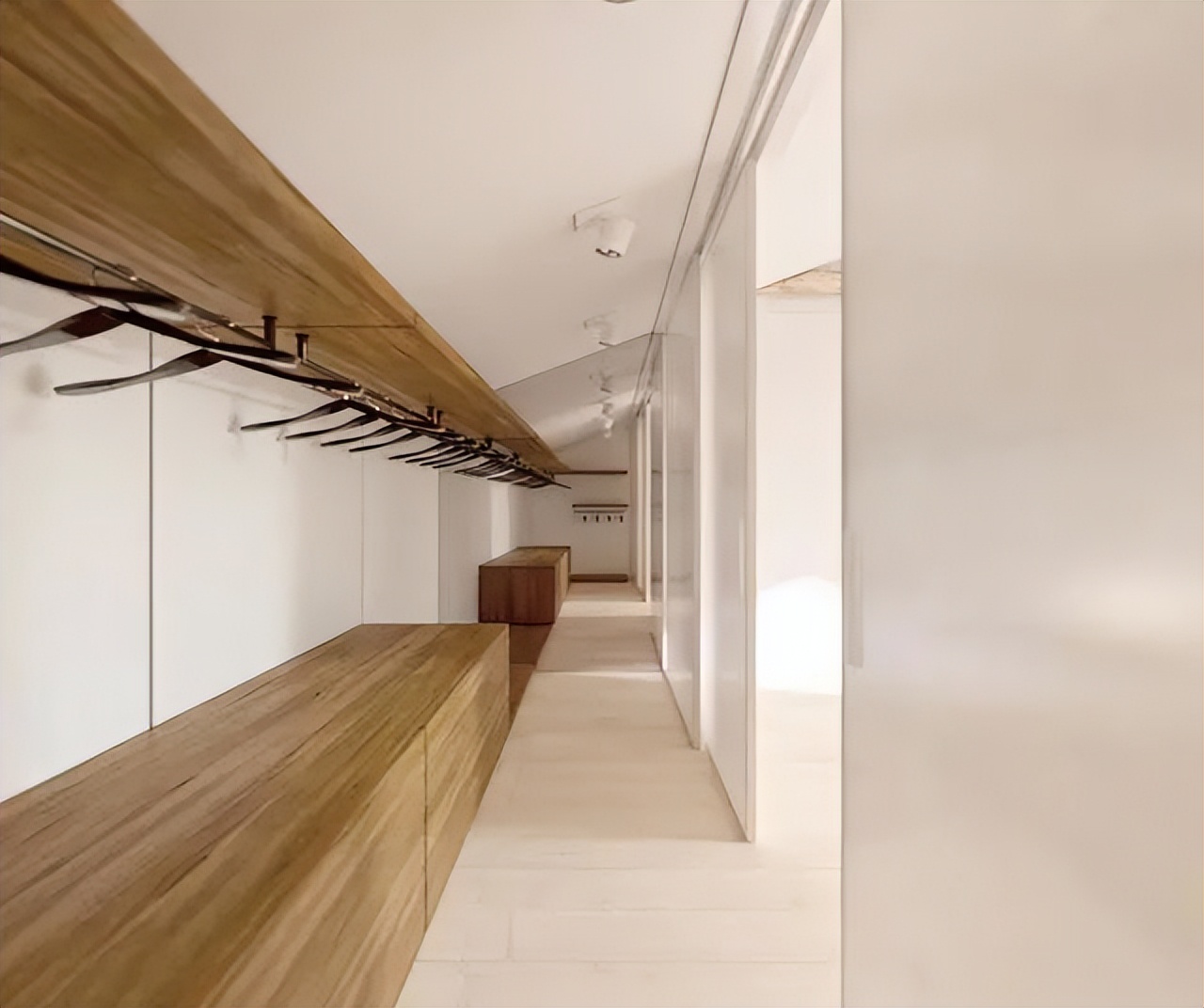 二楼走廊的另一边是更衣室,配有推拉门,很好的保护了隐私使用起来也比较方便。