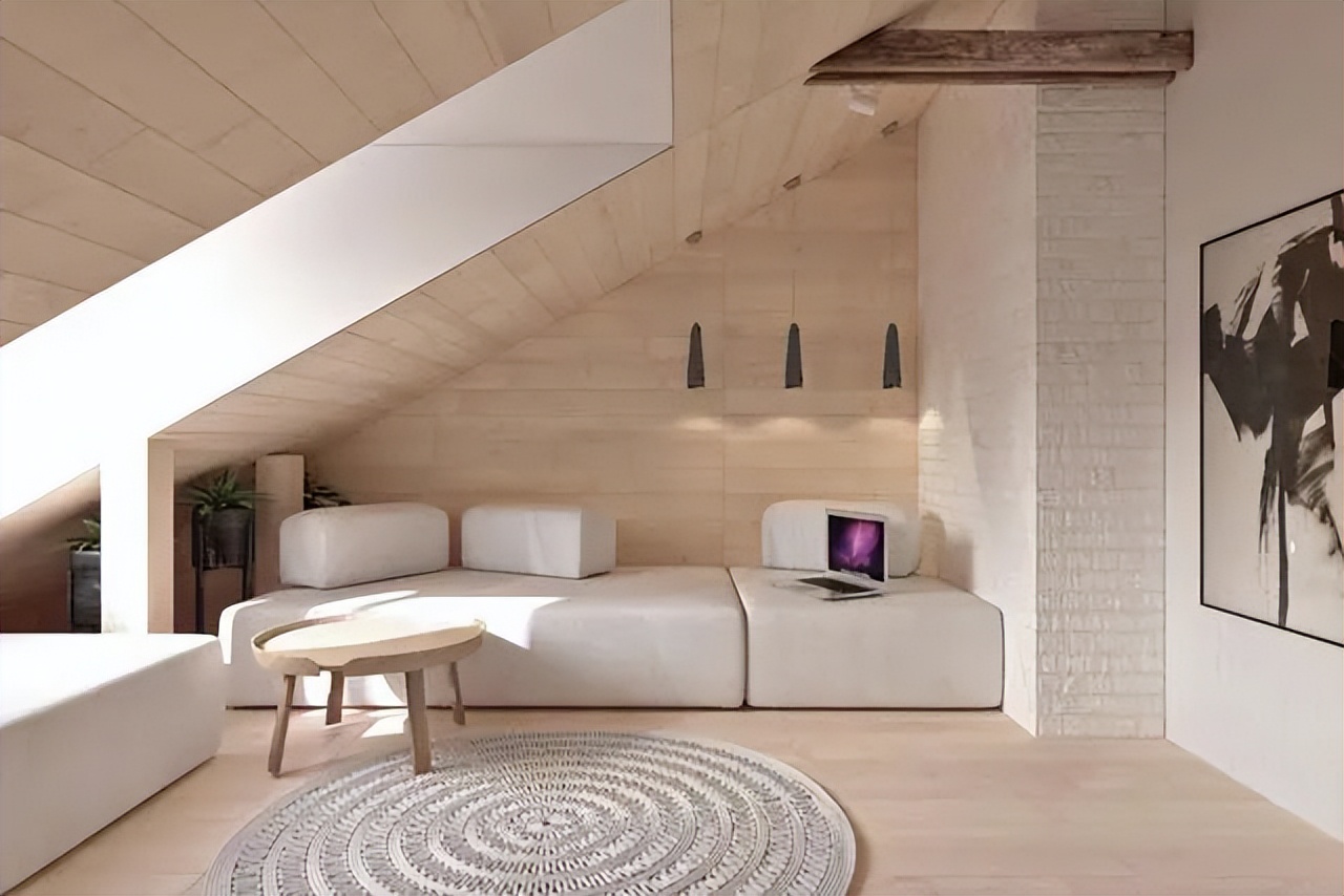 先来看看他家客厅,斜面墙的设计非常有特点,两个斜面墙中间加了一扇窗户,方便房间的透气,窗户前还加了一张可移动沙发,充分利用空间。
