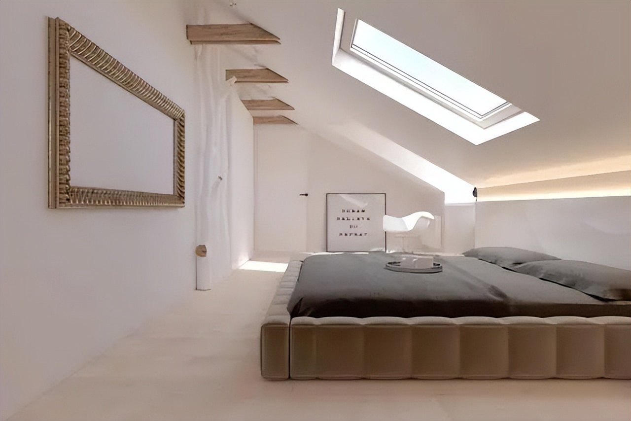 主卧位于公共区书房旁门的内侧,床正上方就有一个斜顶天窗,这种设计让整个空间显得更加开阔,也不用担心隐私问题。
