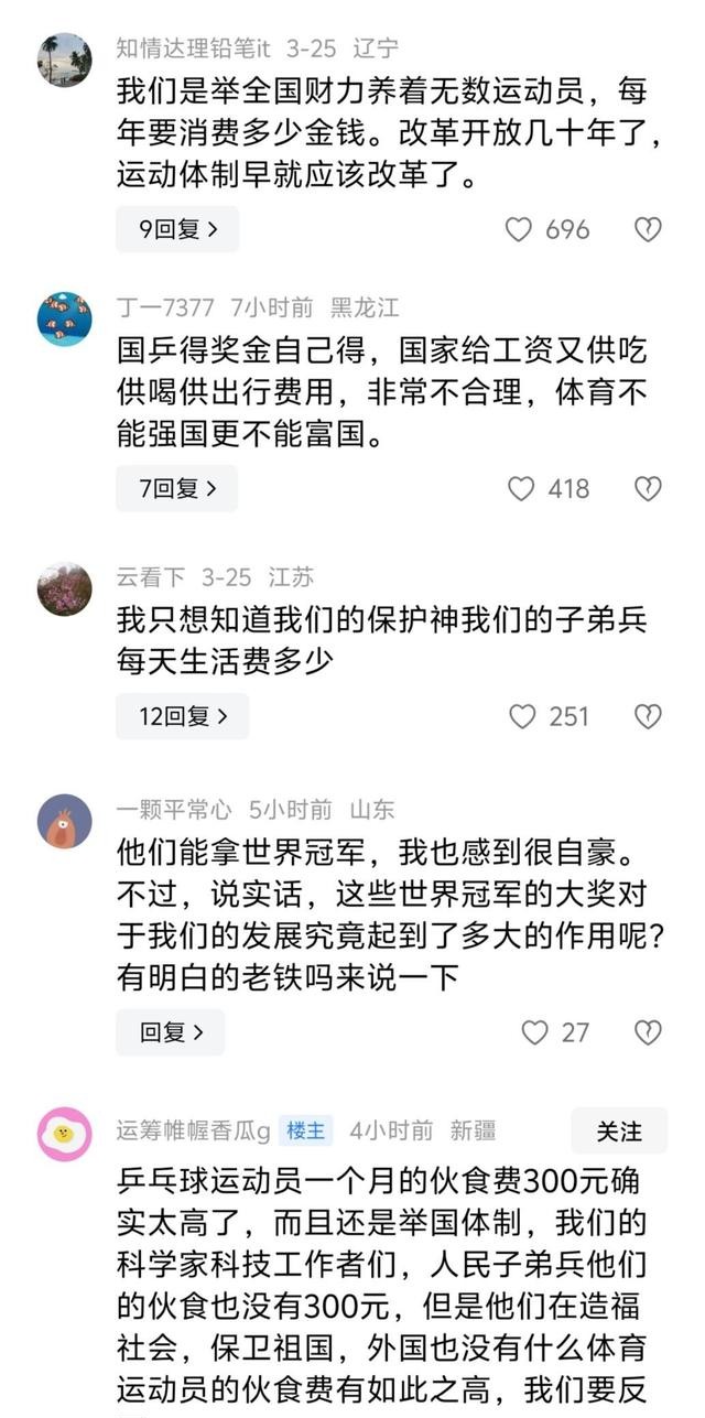 同时,也有网友评论区中询问,人民子弟兵的一天伙食费又有多少,从这就能看出,网友对于这300元标准的不满,那么,国乒队伙食标准为何会这么高呢?