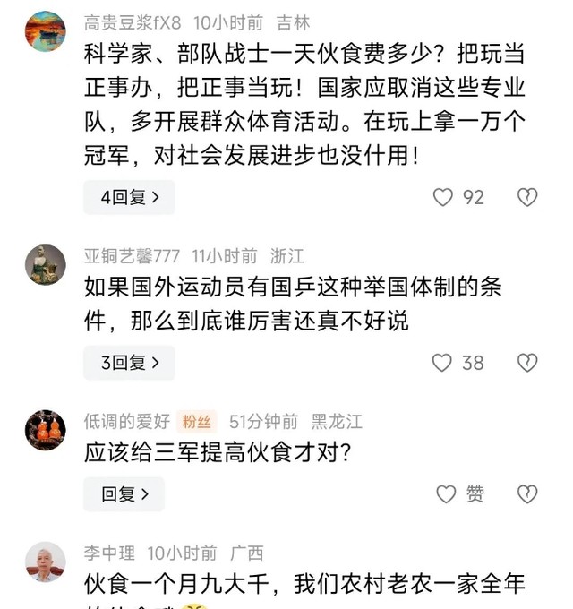 面对这300元的巨款伙食费,很多网友表示,应该取消这种专业队,就算运动员在项目上取得了很多冠军,但对于社会发展进步,似乎并没有什么用,我们更应该重视的是军人、科学家、研究员。
