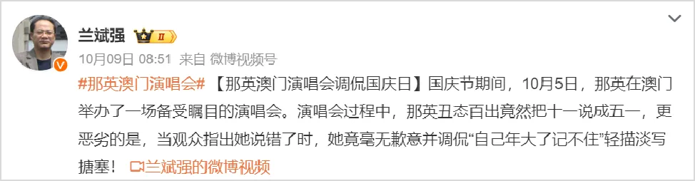 与之相反,某英在10月5日当天于澳门举行演唱会,演唱会过程中,她竟然把十一说成五一,观众指出她说错了时,竟然说“自己年纪大了记不住”来搪塞。把国庆日给忘了,那还能指望她也来一首红歌?可能吗。