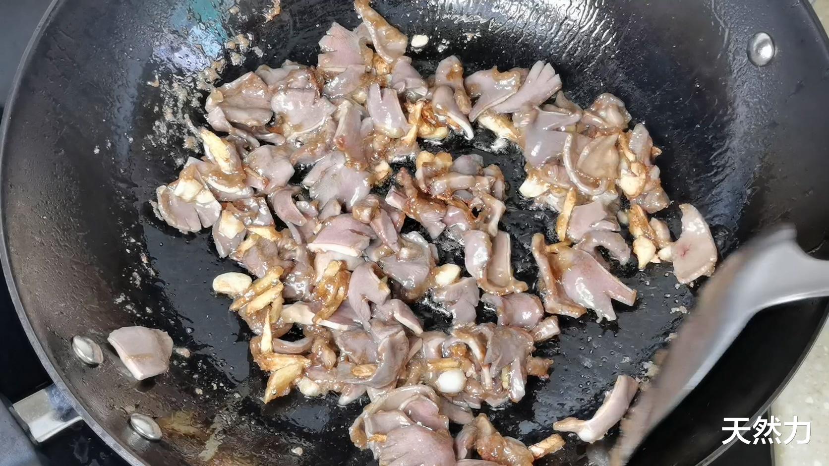 起锅下稍微多一点的油,油温6成热下姜蒜,下鸭胗,快速翻炒,炒到鸭胗没有血红色,这个过程大概只要1分钟左右。