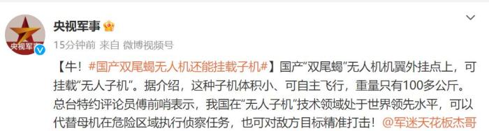 近日,央视对国产双尾蝎无人机进行了深度揭秘,不仅让我们对这款大型察打一体无人机有了更深入的了解,也让我们对“为何中国能成为全球无人机的领跑者”这一点有了更深刻的认识。比如,双尾蝎无人机竟然是全球首款子母无人机,除了自己(母机)能够执行察打一体任务之外,还能由挂载的两个小型无人机(子机)替代母机在高危战场执行察打一体任务。
