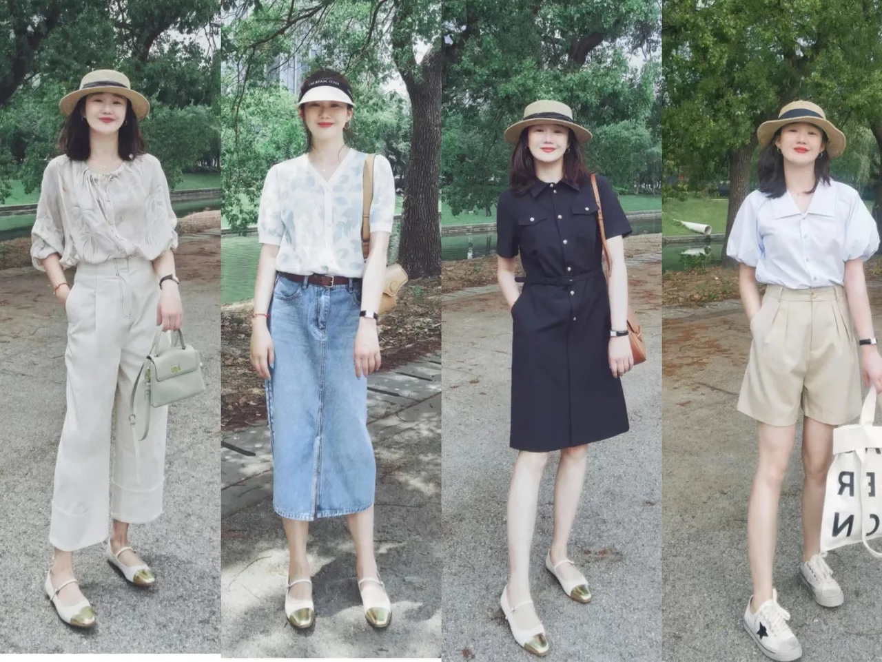 衣服的裁剪不需要太华丽,简单T恤配牛仔短裤,舒适又减龄。也可以多一些纯色系的连衣裙,深蓝色的翻领衬衫裙知性温婉,上班穿也很气质。另外,不要想着把所有时髦元素都穿在身上,用直筒裤搭配娃娃领泡泡袖衬衫,牛仔裙搭配蓝色印染的碎花上衣,通过“繁”与“简”达到量感的平衡,松弛又耐看!
