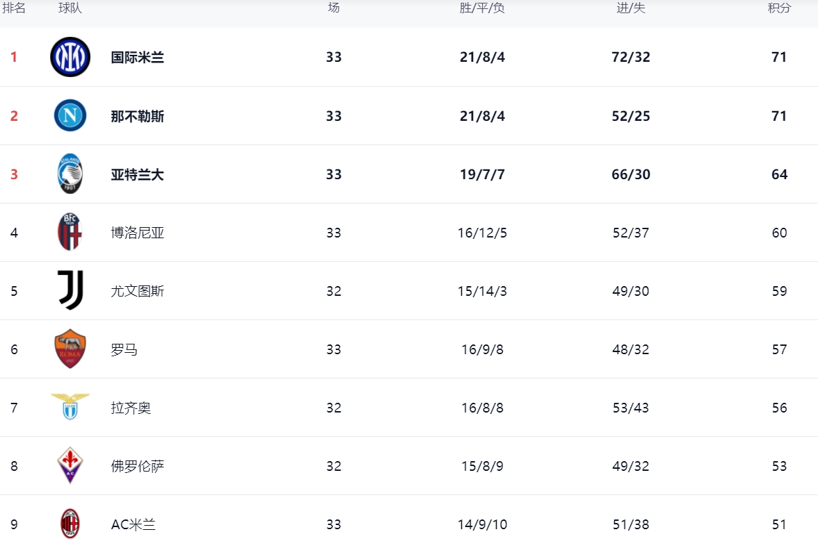 欧战名额争夺白热化由于英超和西甲在欧战积分上反超,下赛季意甲仅有4个欧冠直通名额。随着那不勒斯和国米锁定前两名,剩余两个名额的竞争已呈三足鼎立之势——亚特兰大形势最佳,博洛尼亚手握主动权,而尤文图斯则需在补赛中全力抢分。