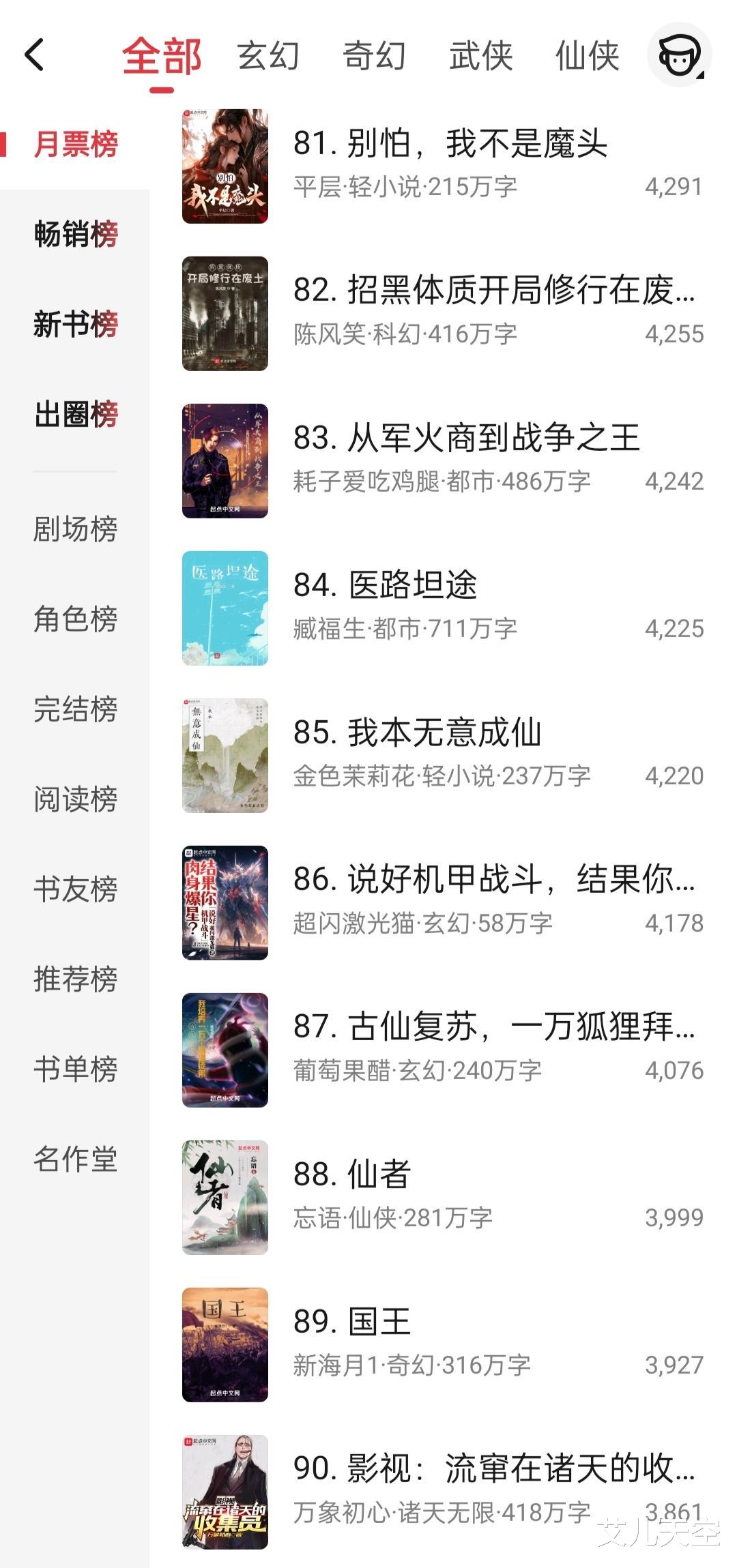 骑行拐杖的马甲作《从军火商到战争之王》相较于上周的一百名提升到了第83名,不过相较于之前的月份,小说排名下滑挺多的。印象里前面是能稳定在前五十的,不知道是不是随着字数的不断增加,剧情已经偏软了。有看过的不妨说说。