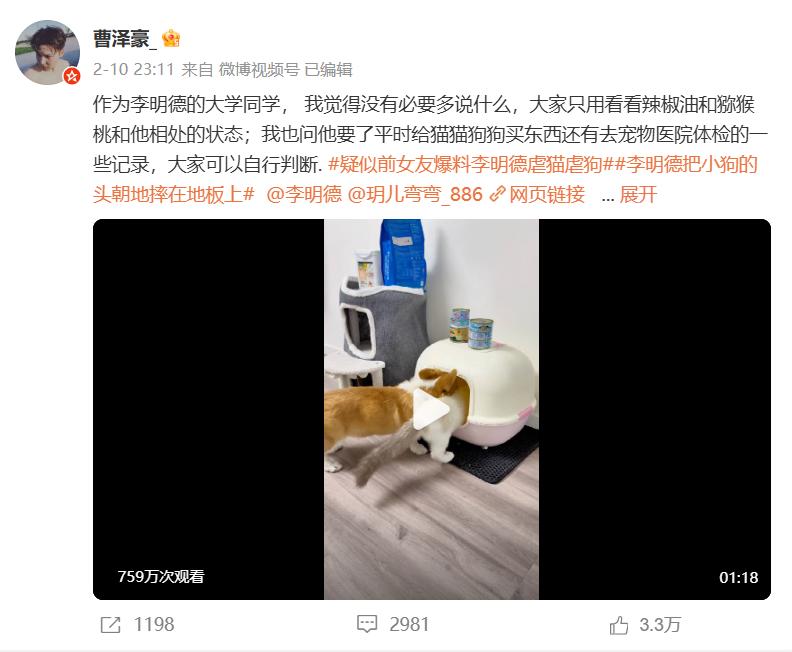 先由李明德前女友“玥儿弯弯”爆料:李明德本人脾气暴躁,多次朝女方要钱。还虐待猫狗,并把小狗的头摔到地上。文章很长,内容很多,不少吃瓜网友看得触目惊心。