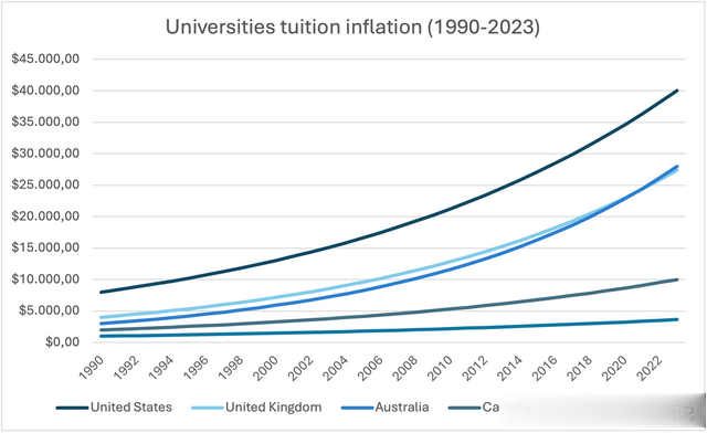哈佛大学(73,000)、斯坦福大学(73,000)、斯坦福大学(68,000)、MIT($70,000)加州大学洛杉矶分校(国际生学费43,000+生活成本43,000+生活成本24,000)全球横向对比国家