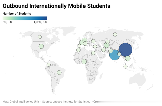 我国不止接待留学生人数多,出国留学人数更是全球第一。根据联合国教科文组织的数据,中国和印度合计占全球国际流动学生的三分之一以上,仅来自中国的出境学生就超过 100 万。