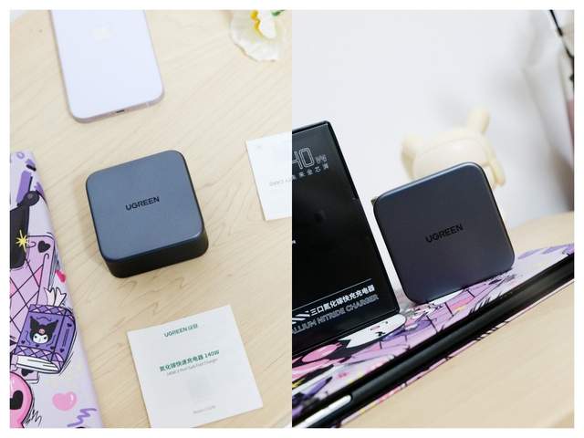 三、绿联140W氮化镓充电器绿联140W氮化镓充电器的尺寸(大约130×130×40mm)和273克的重量,使得它成为旅行和日常办公的理想伴侣。放在桌面上,还是比较简洁的。