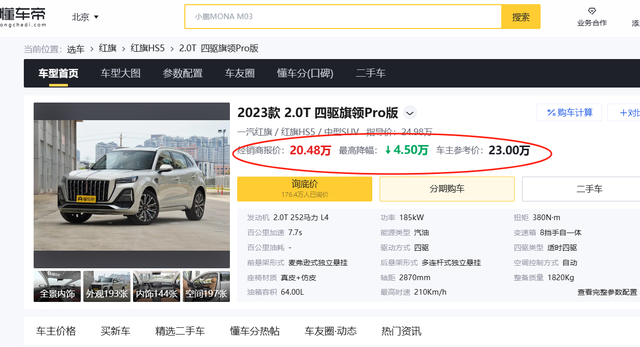 今天给大家介绍一款来自一汽红旗的中型SUV,这就是红旗HS5,它的厂商指导价18.38-24.98万,提供了5款配置在售,还拥有两驱、四驱的版本可选。这款车全系采用了2.0T高功率发动机+8AT的组合,轴距为2870mm。它还配有双联屏设计,座舱内拥有不错的豪华感。目前,这款车在终端有不错的优惠幅度,就拿红旗HS5 2023款 2.0T 四驱旗领Pro版来说,在懂车帝上查询,在北京地区,它拥有4.5万的优惠(各地优惠可能不同,具体详情请咨询当地经销商,以当地优惠为准)。今天,我们就来聊一聊这款车型。
