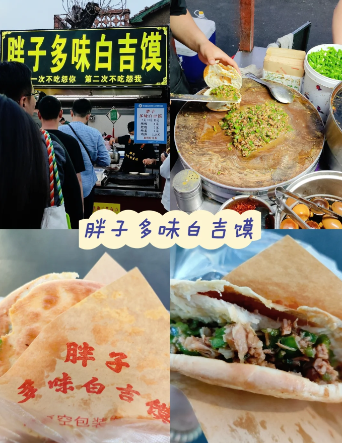 胖子多味白吉馍的摊位⭐⭐⭐⭐⭐前总是排着长队。纯瘦的8元,肥瘦的7元,价格公道。炉子里现烤的烧饼,酥酥脆脆,肉被剁得很烂,夹杂着肉汤汁,每一口都充满了满足感。排队的人很多,但美食的魅力总是让人无法抵挡。