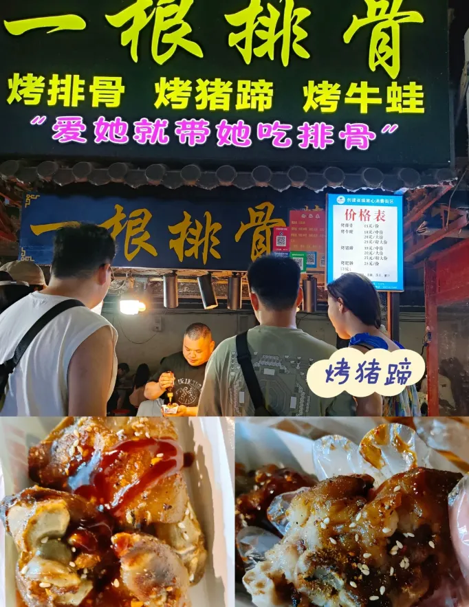 一根排骨的摊位⭐⭐⭐⭐⭐也是夜市的一大亮点。有烤排骨、猪蹄、牛蛙和肥肠等多种选择,均价20元。我们尝试了蜜汁味烤猪蹄,感觉还不错,肉质鲜嫩多汁,让人回味无穷。
