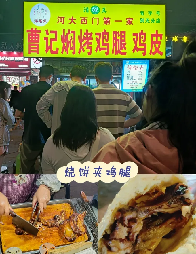 曹记焖烤烧饼夹鸡腿的摊位⭐⭐⭐⭐前也是人头攒动。烧饼夹鸡腿11元,价格亲民。有多种口味可选择,虽然味道没有网传的那么惊艳,但排队的人很多,也许这就是它的魅力所在吧。