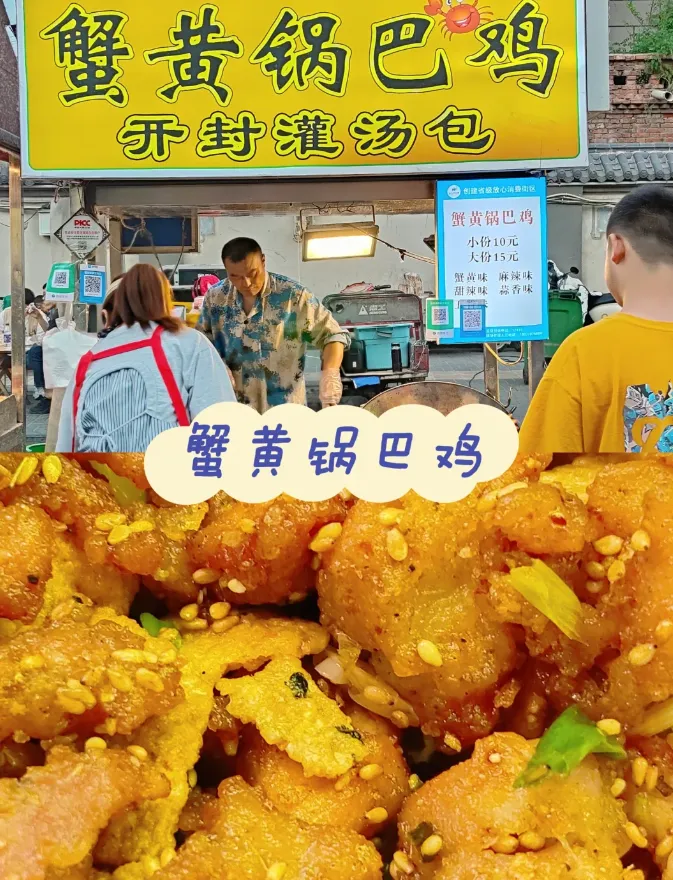 在夜市的角落,蟹黄锅巴鸡的摊位⭐⭐⭐⭐⭐也格外引人注目。小份10元,大份15元,价格实惠。炸鸡和锅巴的完美结合,酥酥脆脆,甜辣味更是让人欲罢不能。每一口都充满了满足感和幸福感。