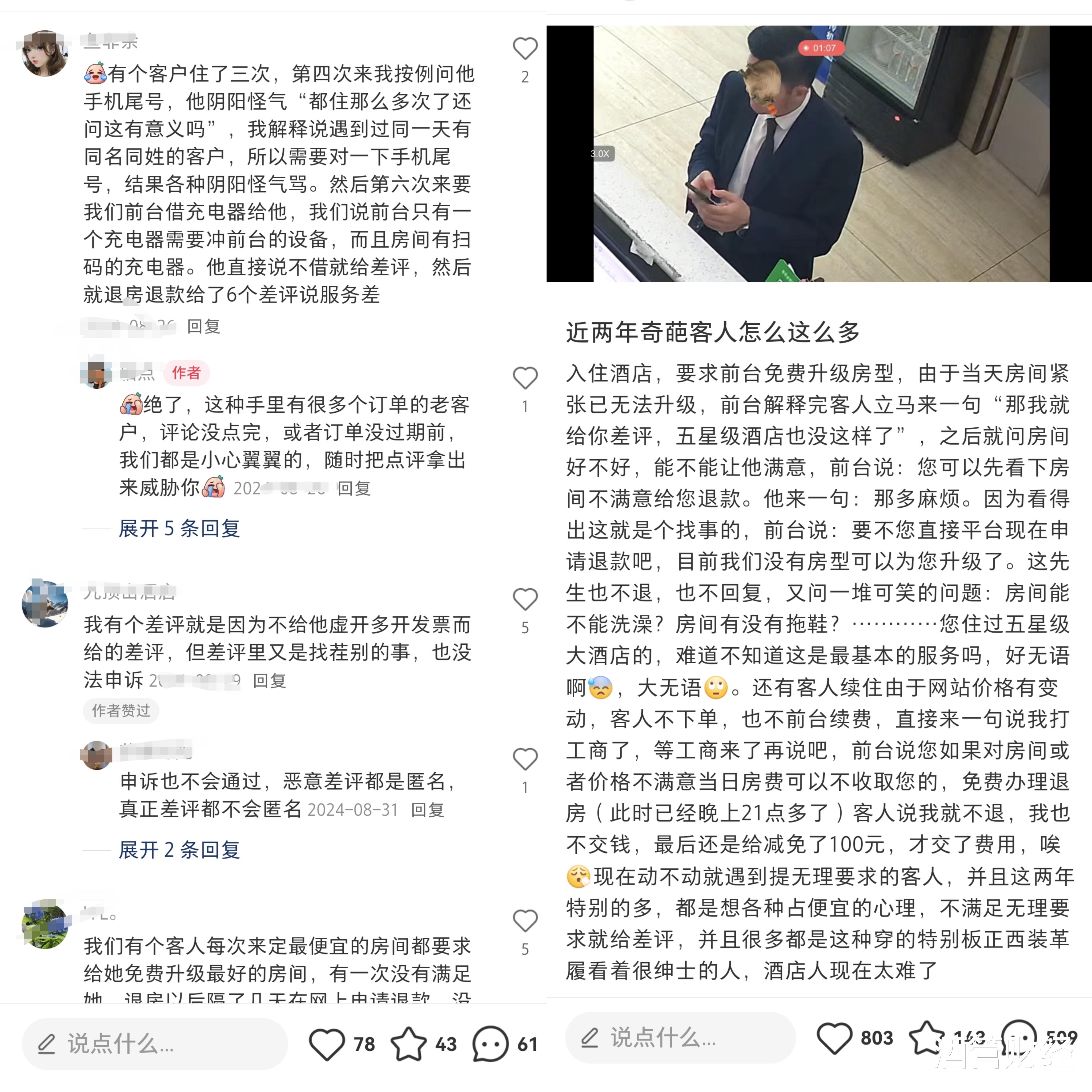 而在小红书平台,更多一线酒店人员分享着自己遭遇的奇葩经历。
