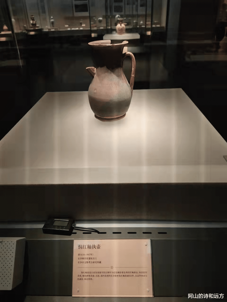 出土于长沙铜官窑的唐代铜红釉执壸造型美观,釉色鲜艳亮丽。