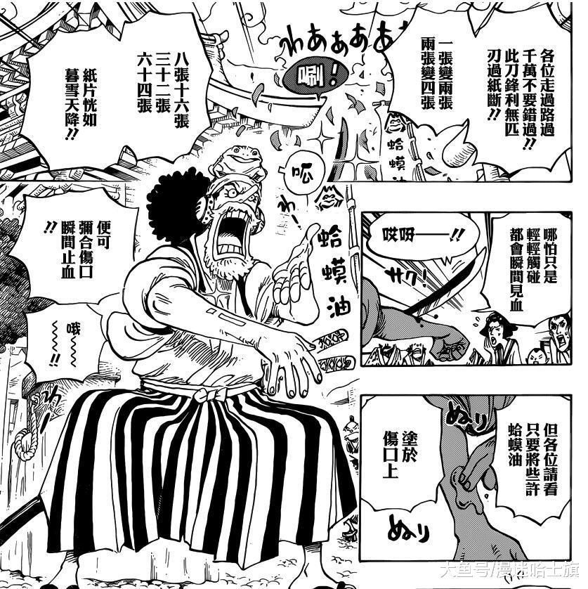 第二个出场的是蛤蟆油商人-乌索普,正在大街上为大家展示自己蛤蟆油的惊人药效。乌索普的伪装比弗兰奇稍微有诚意一点点,不仅换上和和之国的装束,并且还戴上了假胡子。不过雪白的胡子配上乌黑的头发,你是认真的吗?
