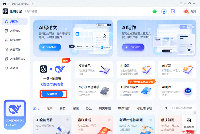 ▪ 下载安装后打开软件,找到并点击首页的【一键本地部署deepSeek】下的“立即体验”。