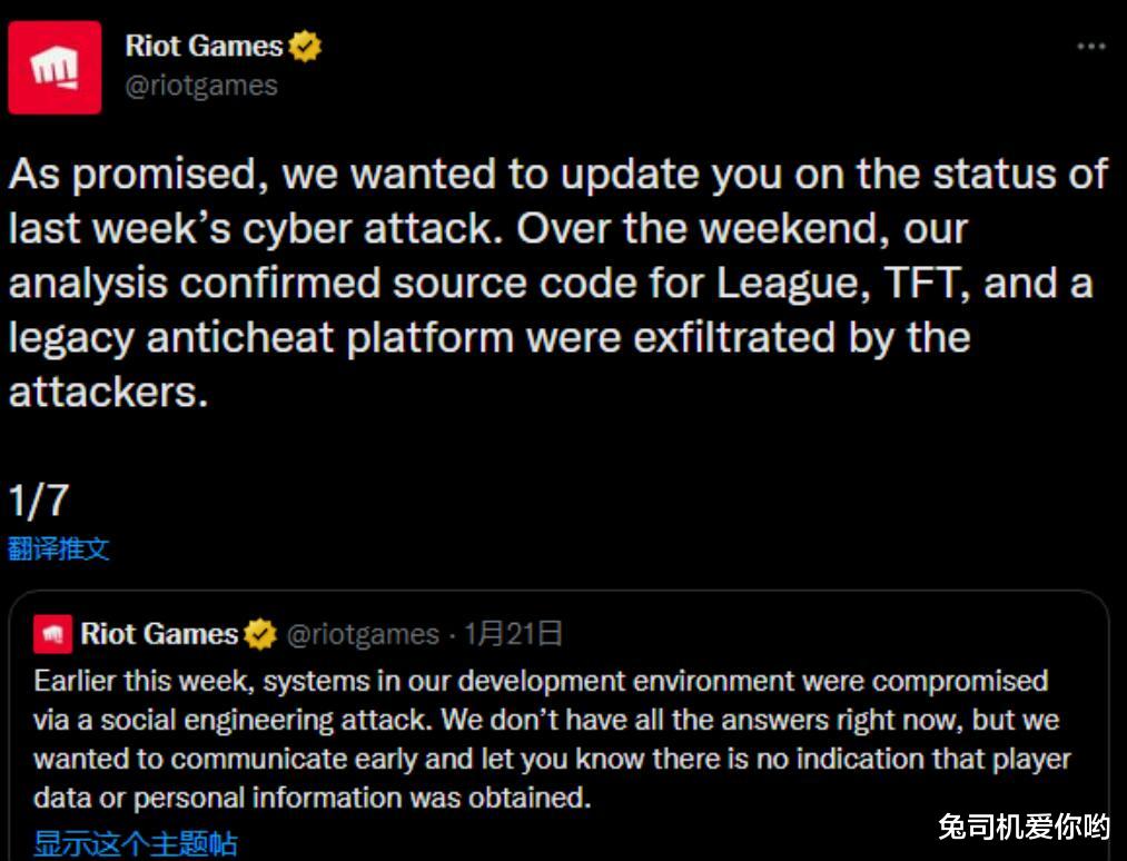 对于任何一个游戏来说,源代码都是极为重要的资产。它不仅展示了整个游戏的架构,而且还展示出了游戏有哪些漏洞。不幸的是,LOL的研发商拳头游戏日前宣布,《英雄联盟》、《云顶之弈》和一个遗留的反作弊平台的源代码已经被黑客所窃取。