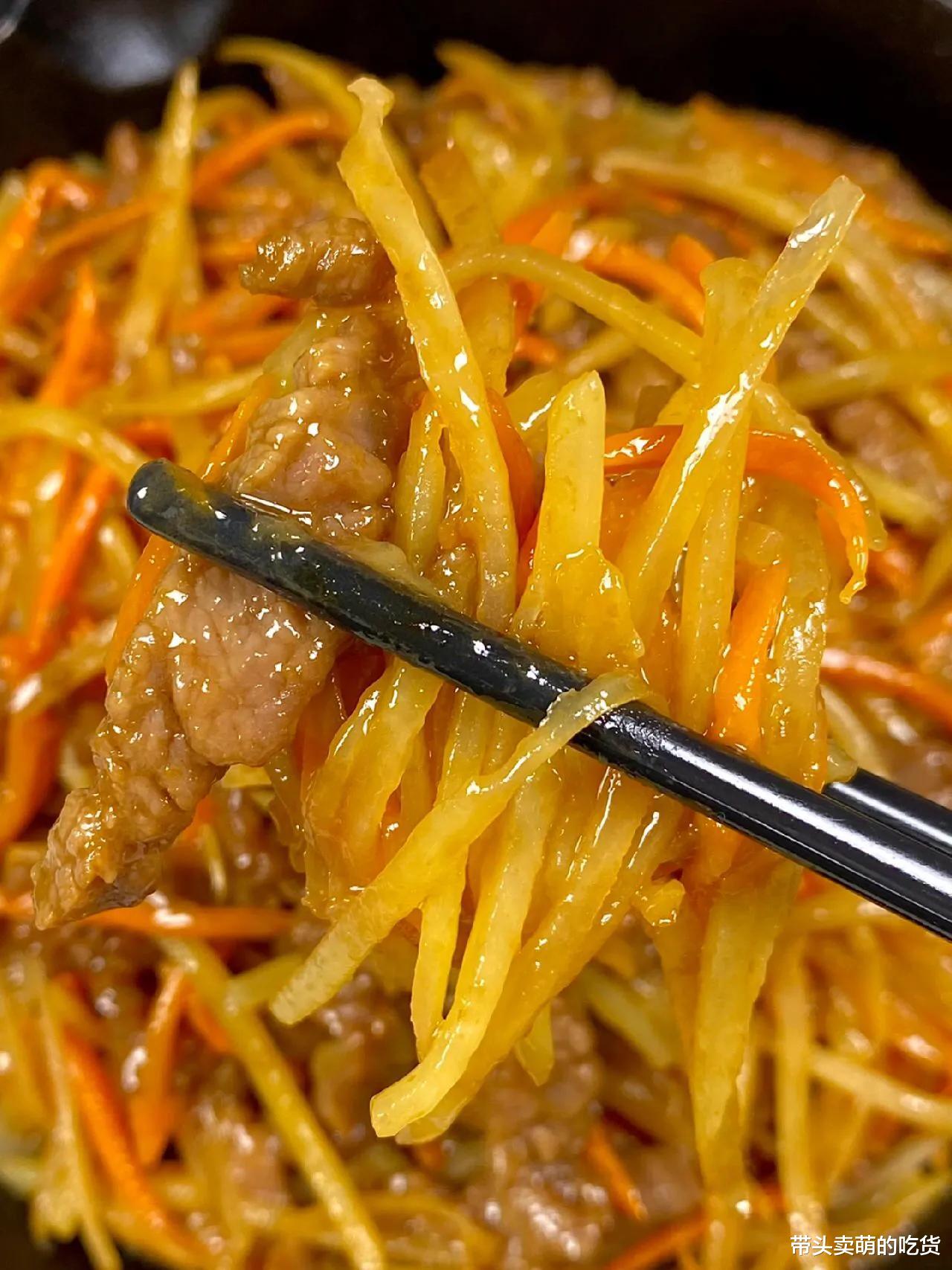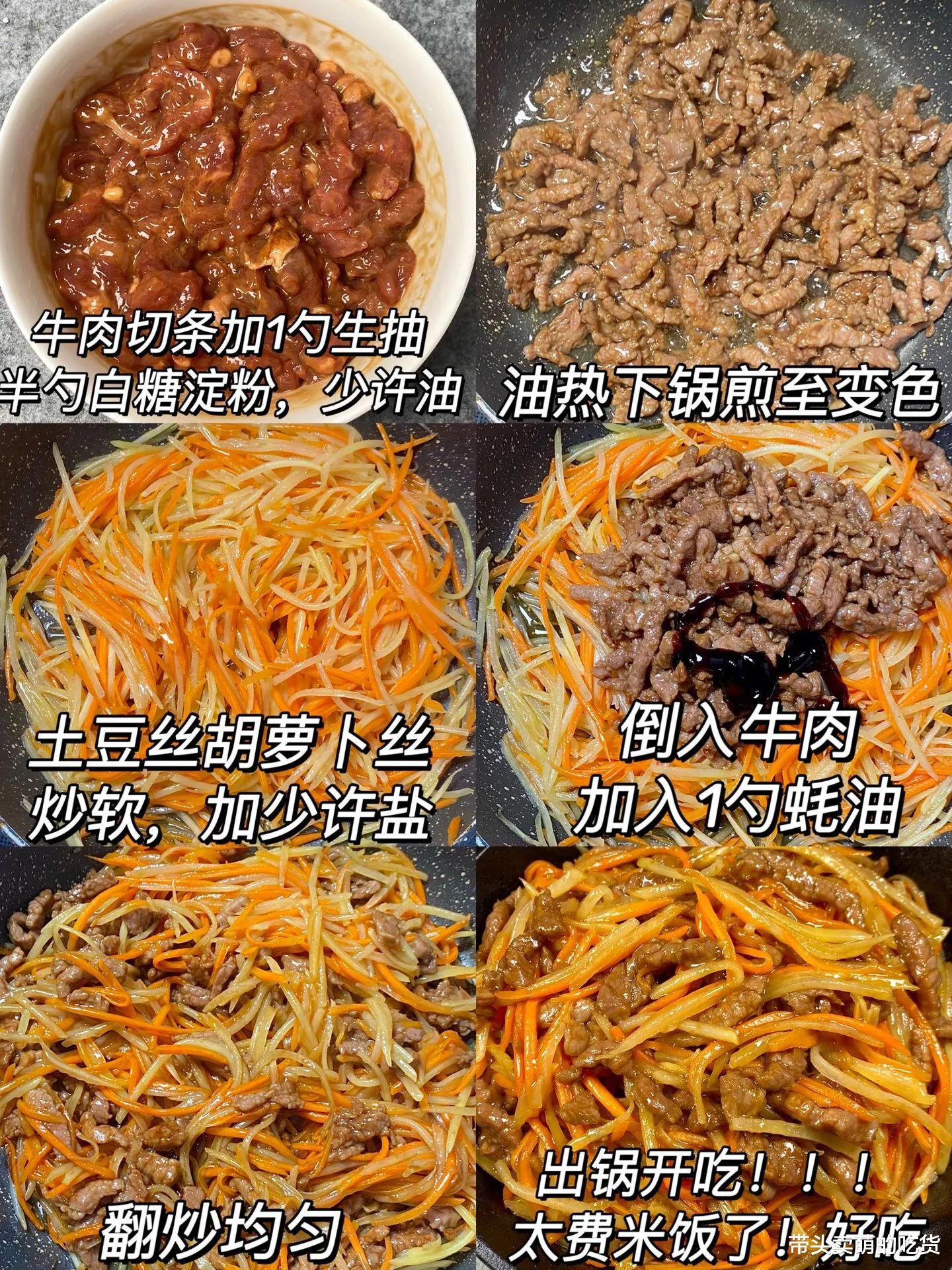 主要食材:牛肉,胡萝卜丝,土豆丝,蒜末,生抽,淀粉,白砂糖,蚝油,盐,其实土豆丝也已经算是主食了,主打就是一个爽脆加牛肉的嫩滑,虽然这道菜很下饭,家常吃没关系,如果是有兼职要求,就把饭量稍微减少一点留给土豆丝。