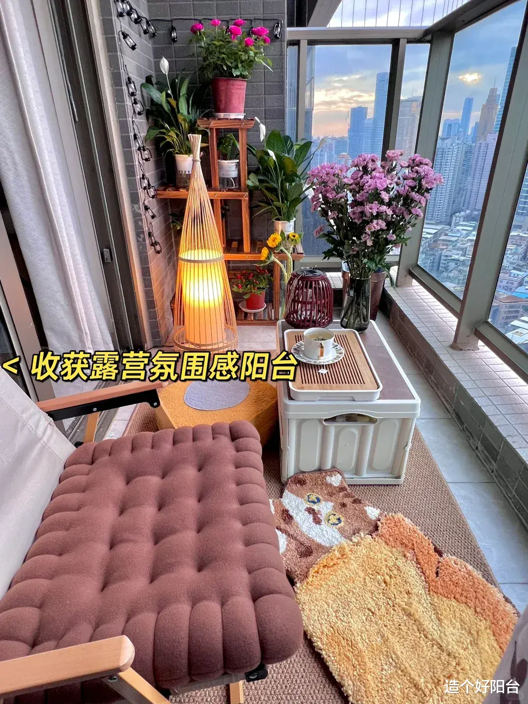 为了营造露营的氛围,她精心挑选了一张柔软的地毯,铺在阳台上,既隔绝了地板的凉意,又增添了几分温馨。这张地毯成了整个阳台的基底,让人一踏入便感受到家的温暖。随后,她动手组装了一个简约风格的绿植收纳架,将一些小巧的绿植和装饰品错落有致地摆放上去,瞬间为阳台增添了几分生机与活力。