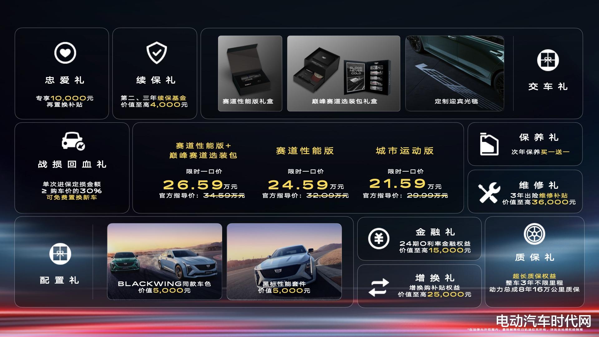 (2025年3月1日)时隔3年,凯迪拉克Vday性能大赏今日在浙江国际赛车场激情重燃,巅峰性能豪华车全新CT5也同时上市。新车共推出城市运动版和赛道性能版两款车型及巅峰赛道选装包,限时一口价21.59万元起,入门即高配。同时,用户可享10大丰富豪礼,包括价值10000元的限定车色和黑标性能套件、至高25000元增换礼、再置换专享10000元忠爱礼等。值得一提的是,全新CT5还重磅推出了“战损回血礼”,即车辆单次定损超三成即可免费置换等价新车,为年轻人的第一台后驱车霸气兜底。延续28年的豪华运动传奇,全新CT5以巅峰性能与至臻豪华捍卫机械荣光,为追求纯粹驾驶激情的年轻人带来最好的燃油车,BLOOD NEVER COLD!*置换礼包括品牌置换补贴至高10000元和国补/地补至高15000元.