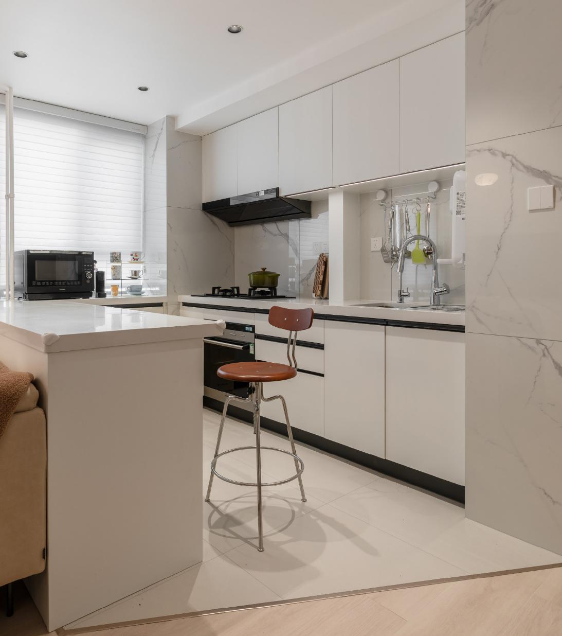 厨房做了U型布局设计,并通过台面加宽的方式,打造出了一个多功能小吧台。这样不仅弥补了厨房的操作与储物面积,也为生活带来了一些趣味性。