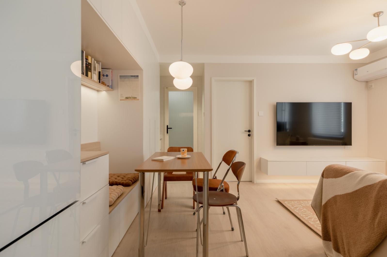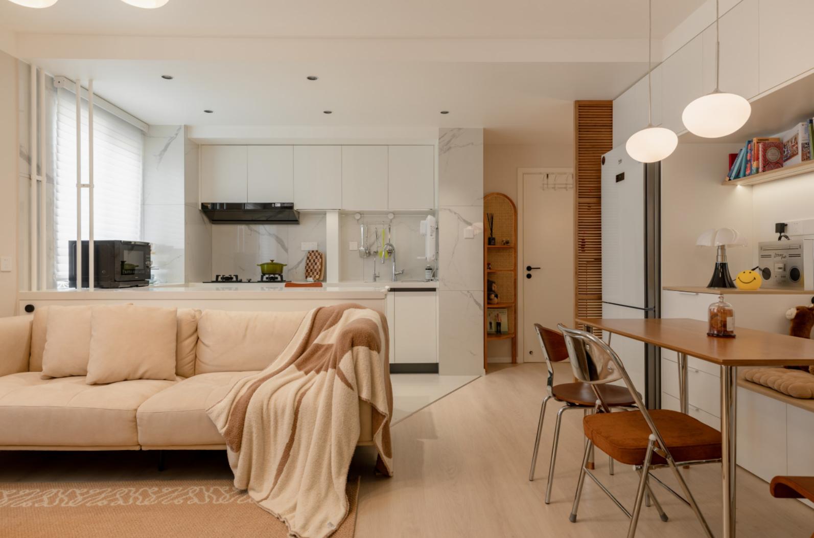 打开后的厨房与客餐厅形成了一体化的结构,也让原本不足50㎡的户型,有了开阔通透的空间表现。而像这种一切尽收眼底的空间,不仅仅是居住安全感的一种体现,也充分体现了屋主对自由生活的向往。