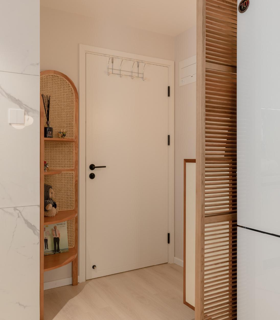 外玄关增加成品超薄鞋柜和换鞋凳,解决日常换鞋收纳需求;内玄关增加翻斗柜和藤编置物架,可以收纳家居拖鞋,以及摆上香薰、装饰品,让入户更有仪式感。