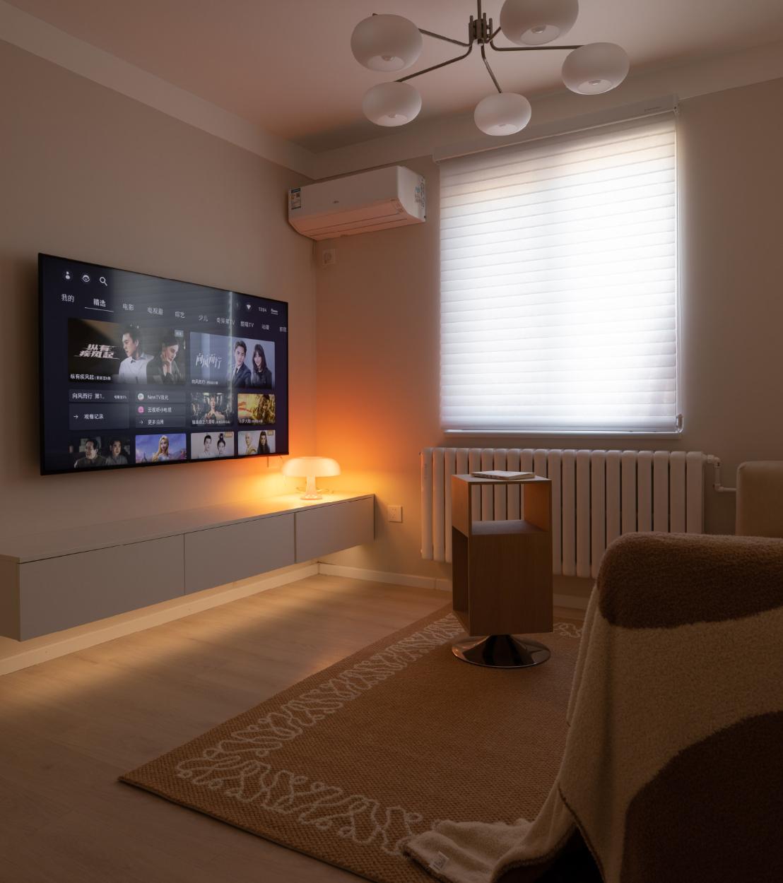电视墙直接留白,简洁又清爽;而一组悬浮式抽屉柜的增加,也在拉伸层次的同时,解决了电视盒子、路由器等物品的收纳,使空间更加秩序整洁。
