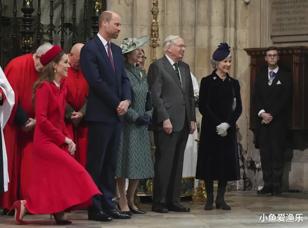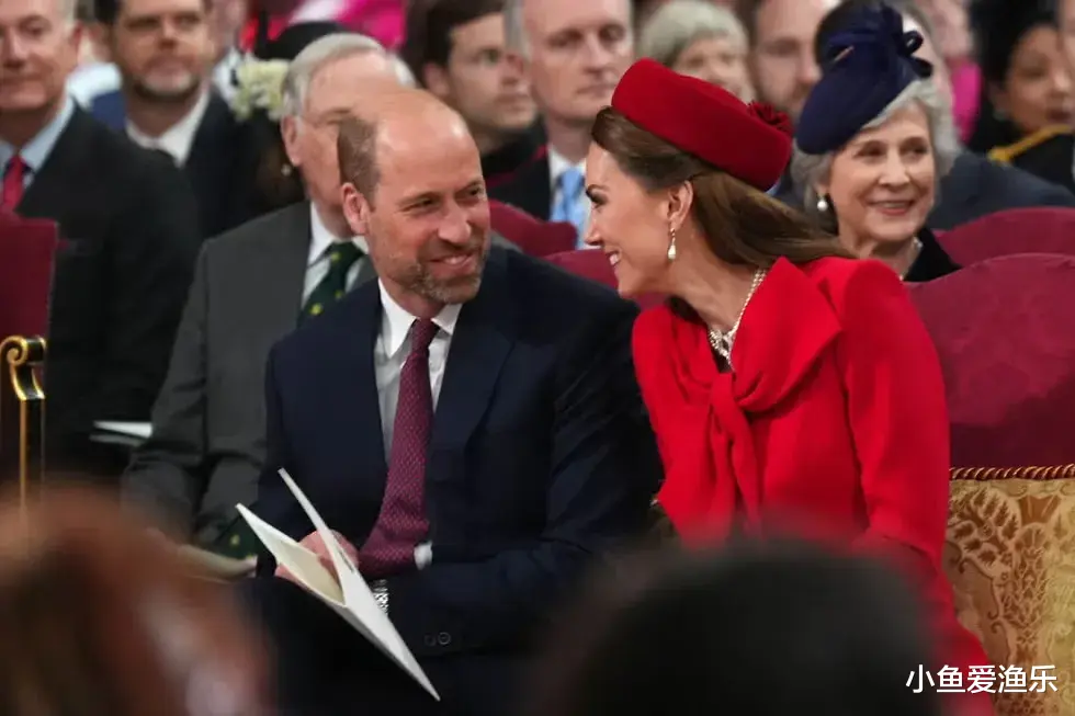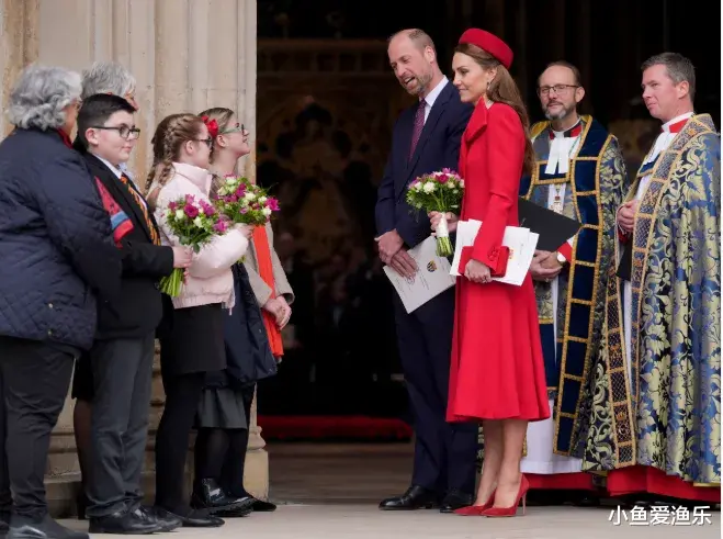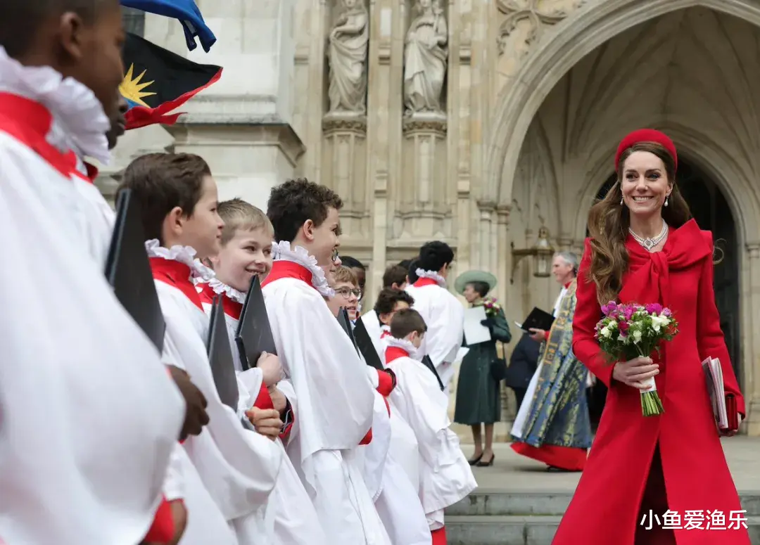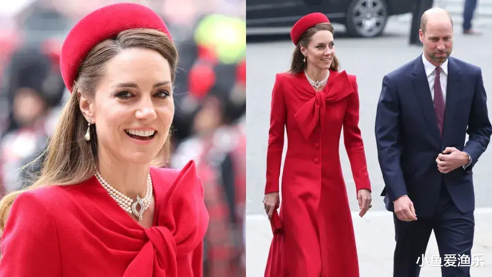 本月10日的威斯敏斯特教堂,凯特穿得像朵怒放的玫瑰。猩红色凯瑟琳·沃克外套裙衬得她容光焕发,领口那只张扬的蝴蝶结简直要把镜头戳破。