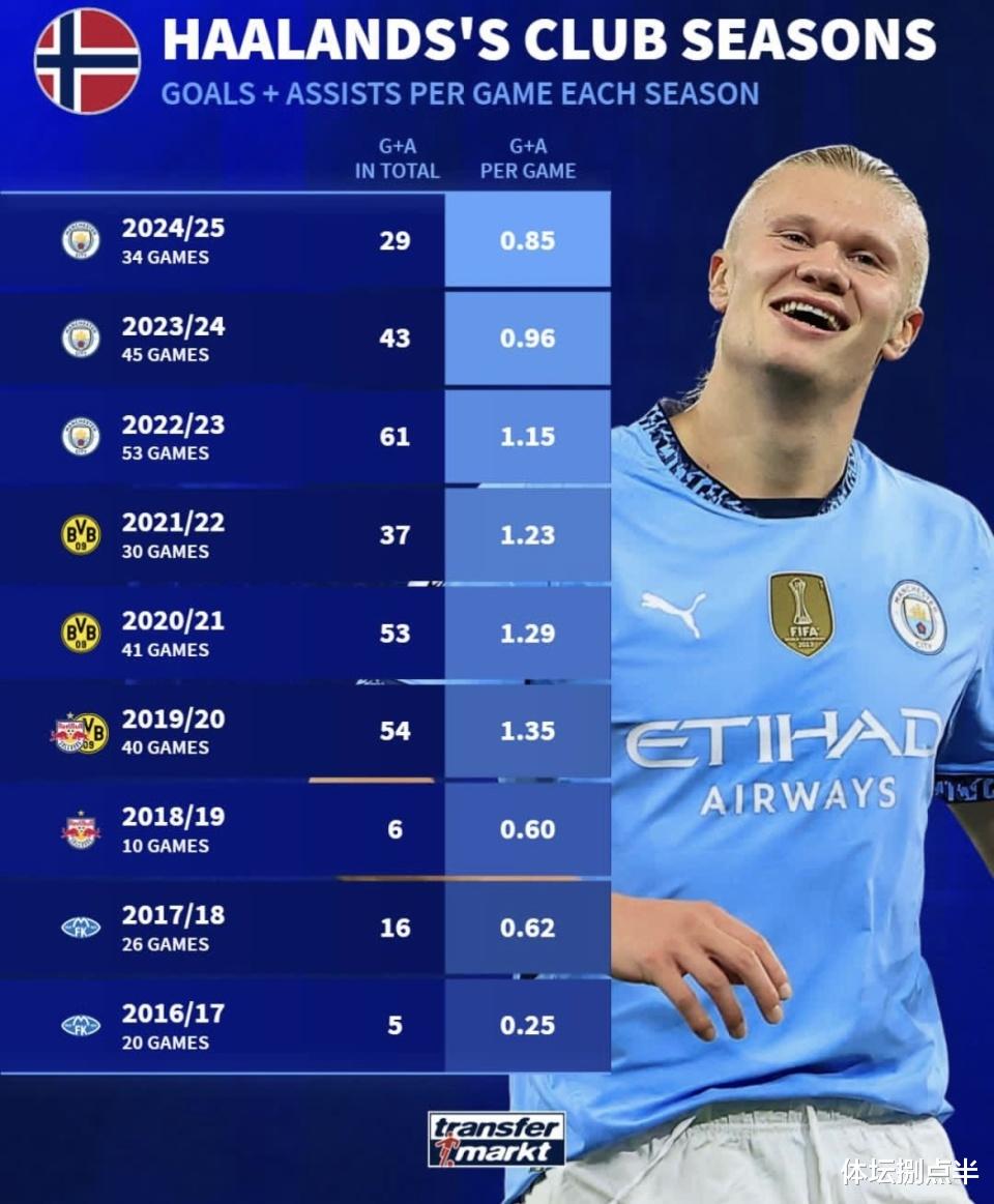 尽管如此,他的场均数据依然保持在极高水平,尤其是在英超和欧冠这样的高强度比赛中,依然是世界顶级前锋的表现。这种下降趋势更多反映了联赛强度、战术变化和体能消耗的综合影响,而非能力的减弱。