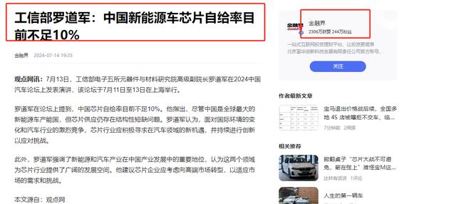 金融界 2024-7-14 《工信部罗道军:中国新能源车芯片自给率目前不足10%》