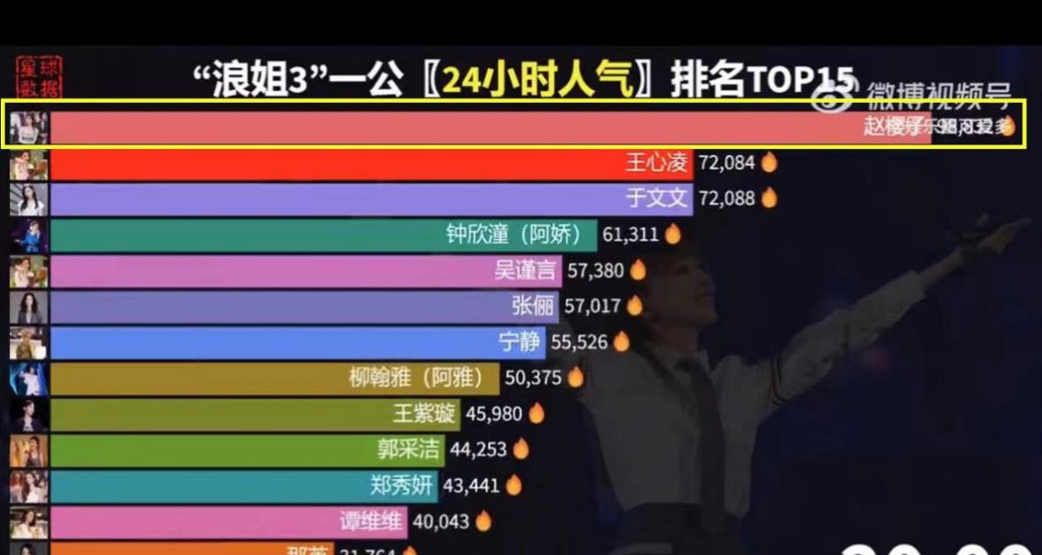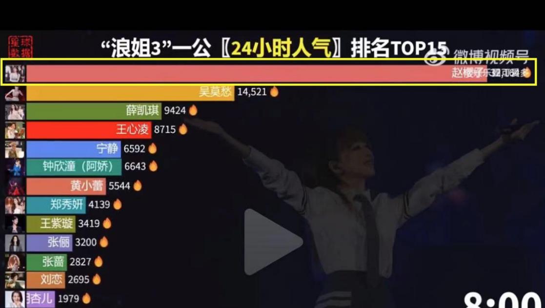 可以说近期赵樱子真的火得一塌糊涂,风光无限,不管是口碑还是热度,双双都爆了。哪怕一公表演同组的是内娱大姐大宁静和港圈回忆阿娇(钟欣潼),哪怕舞台上还有浪姐3开播前的大热门Jessica(郑秀妍)和第一期后翻红的王心凌·····在浪姐3一公“24小时人气排行”TOP15的榜单上,赵樱子都是妥妥的第一名,着实在血雨腥风中杀出了一条耀眼星路。