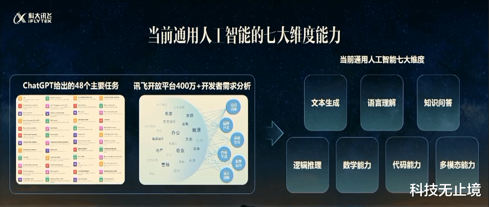 科大讯飞董事长刘庆峰表示,认知大模型是通用人工智能的曙光,它出现的历史意义不亚于PC或者互联网的诞生。在发布会现场,刘庆峰从ChatGPT关注的48个主要任务和讯飞开放平台400万+开发者的需求分析,详细解读了当前通用人工智能应当具备的七大能力维度。其中每一大维度对人类的生产生活都会造成深远影响,比如文本生成将颠覆内容生产模式,用户只要对内容进行画龙点睛的简单加工,就可以将一个文案快速的生产出来,未来人人都可能成为自媒体创作者。