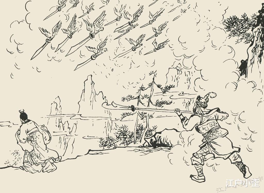 就在此时,关羽从云中落下,大喝一声:“孽畜,还敢逞凶?”沙刀精吓得不敢近前,众飞刀见是老板来了,失了金光,坠落尘埃。