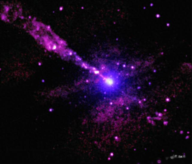 在最近的研究中,钱德拉X射线望远镜捕捉到了一个惊人的现象:在黑洞喷流的某个位置,出现了一个分叉,这一发现引起了科学家的极大关注。于是,科学家们开始深入研究这个现象,并提出了一个大胆的假设:这可能是因为黑洞的喷流撞击了一个巨大物体。