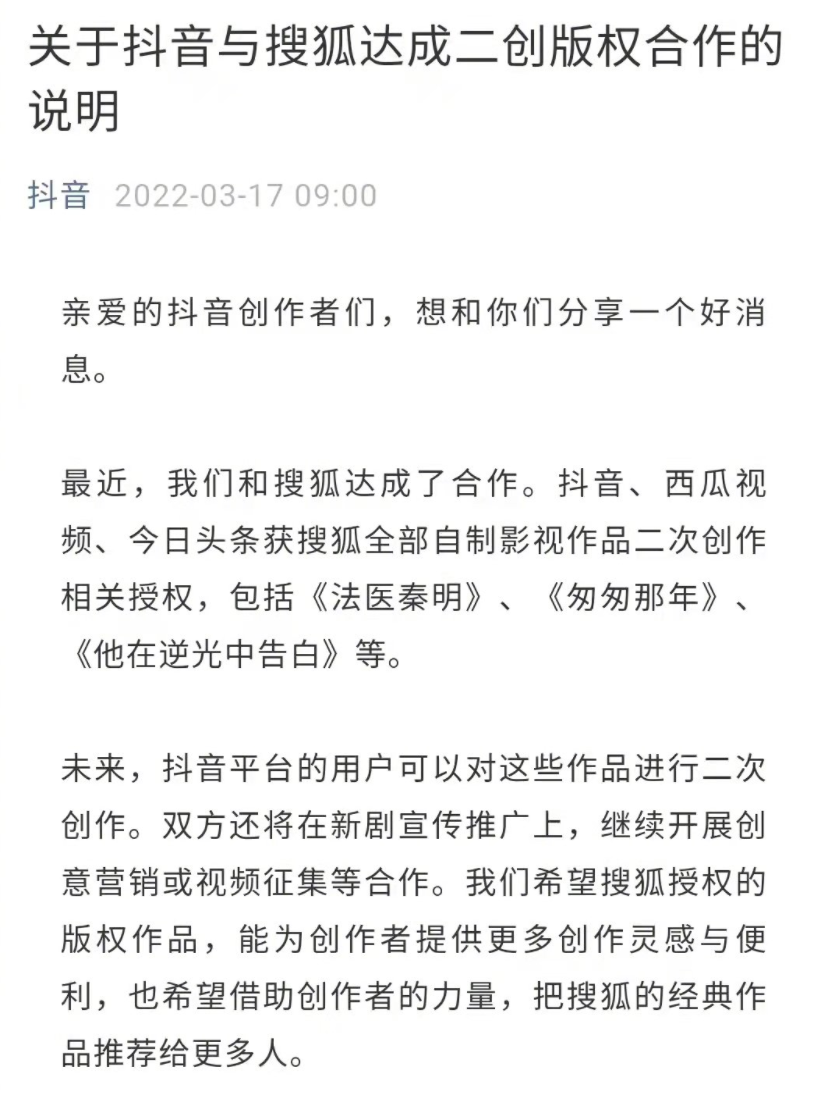 近日,抖音宣布与搜狐达成合作,获得搜狐全部自制影视作品二次创作相关版权,包括《法医秦明》《匆匆那年》《他在逆光中告白》等,双方达成合作后,抖音平台和用户可对这些影视作品进行五分钟之内的剪辑、编排或改编。此外,未来双方还将在新剧宣传推广上,继续开展创意营销或视频征集等合作。